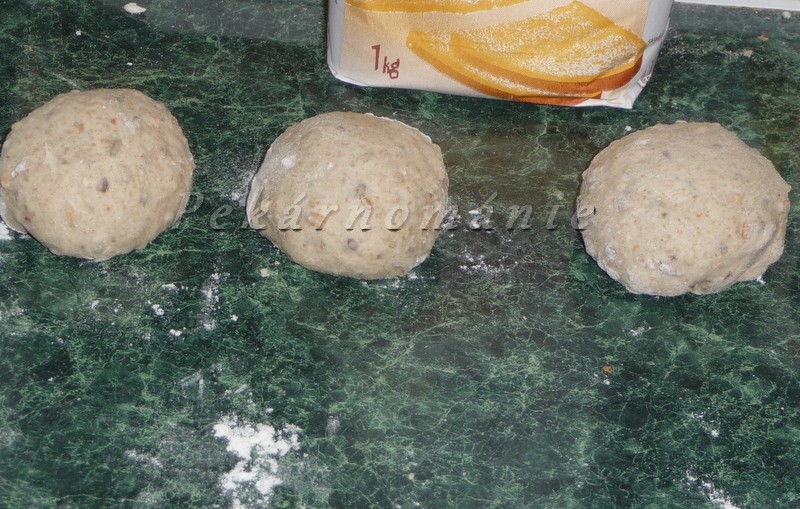 Vyndáme ho, na lehce pomoučené ploše ho propracujeme, rozdělíme na 12 kusů a ze všech uděláme bulky, které necháme asi 10 minut odpočinout.