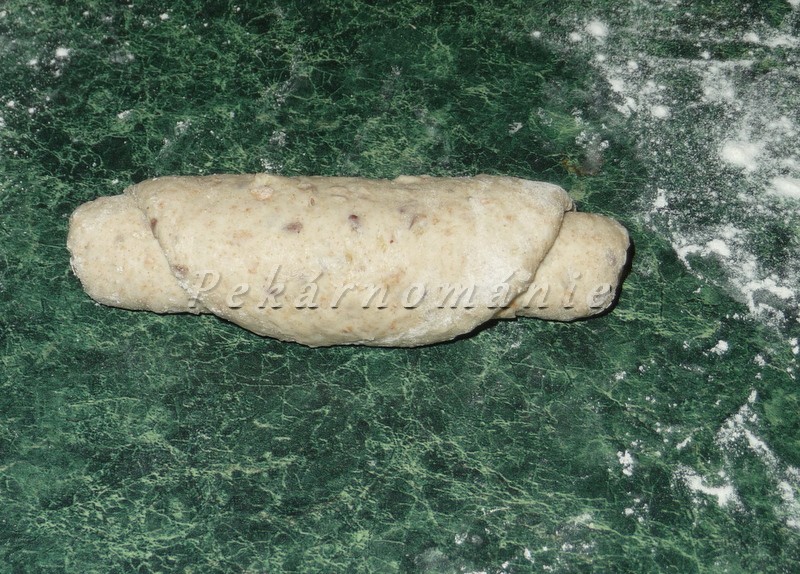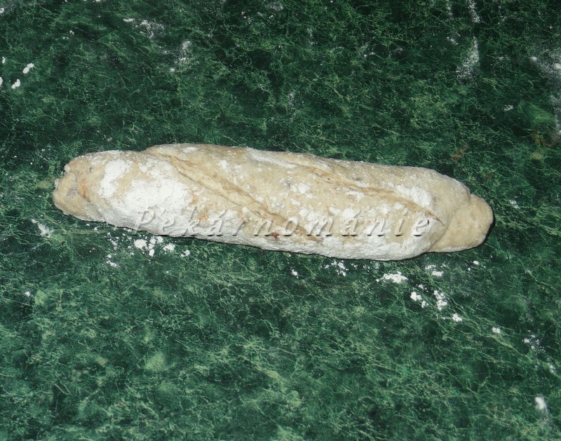 Každou bulku vyválíme na ovál, ten srolujeme do rohlíku a následně ještě tlakem dlaně rohlík vyválíme do tenčího průměru. (Při vyvalování můžeme, pokud je třeba, pracovní plochu lehounce podsypnout moukou – tady ale pozor Pokud podsypete hodně, těsto při svinování nebude přirozeně lepit a rohlík se při pečení může rozvinovat.)