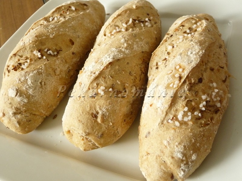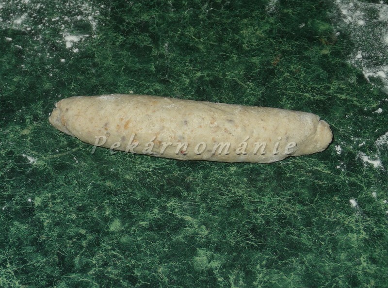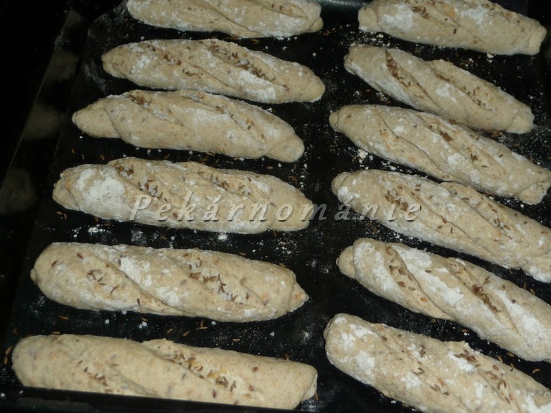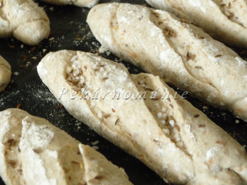 Hotový rohlík lehce oválíme v žitné mouce, dvakrát hlouběji a šikmo nařízneme a necháme na plechu kynout. Rozvírající se zářezy sypneme celým kmínem a hrubou solí.