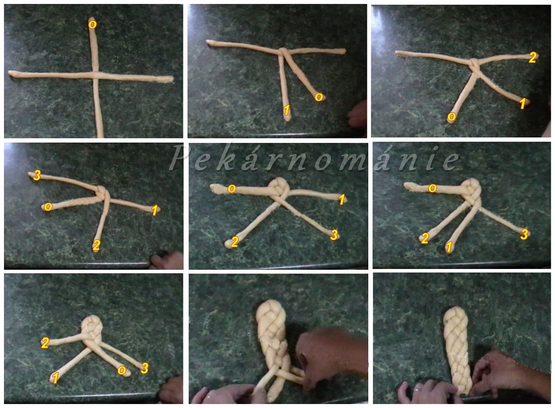 Další ze způsobů zaplétání pečiva, tentokrát ze dvou pramenů. Použitelné jak pro slané pečivo, tak pro sladké – třeba na výrobu (motání) makovek.