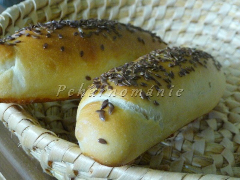 Pak těsto dobře propracujeme, rozdělíme na 10-12 kousků, z každého uděláme bulku a necháme asi 10 minut kynout. Mírně nakynuté bulky rozválíme na ovál, z každého smotáme rohlík, který ještě dlaní rozválíme na delší a tenčí. Všechny rohlíky necháme kynout na jednom plechu s pečícím papírem nebo fólií, pak je pomašlujeme vejcem, hustě posypeme lněným semínkem a ve vyhřáté troubě upečeme (250°C/asi 7-10 min).