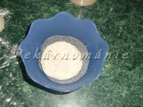 Poté každou bulku mírně zploštíme, jednu stranu jí potřeme vodou a mokrou stranou pak vtiskneme do máku.