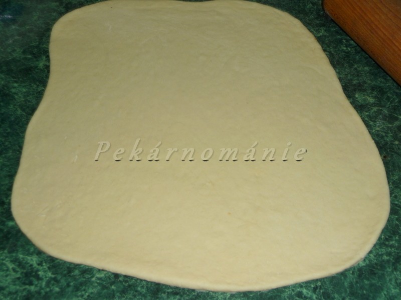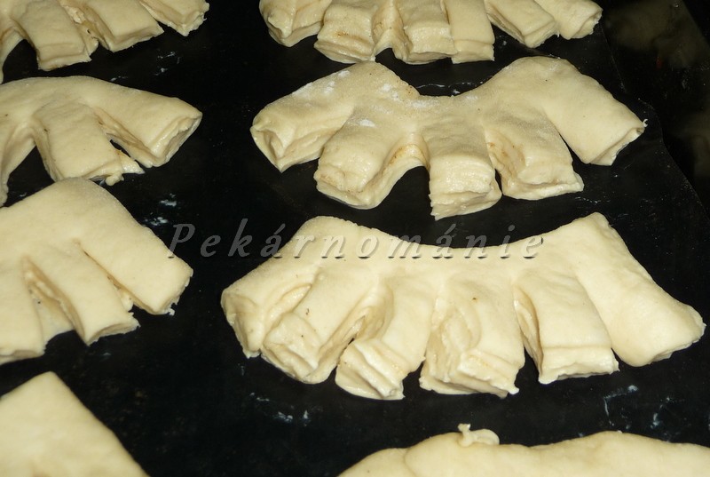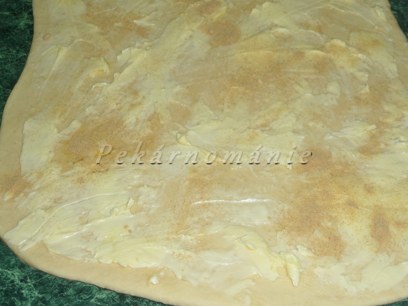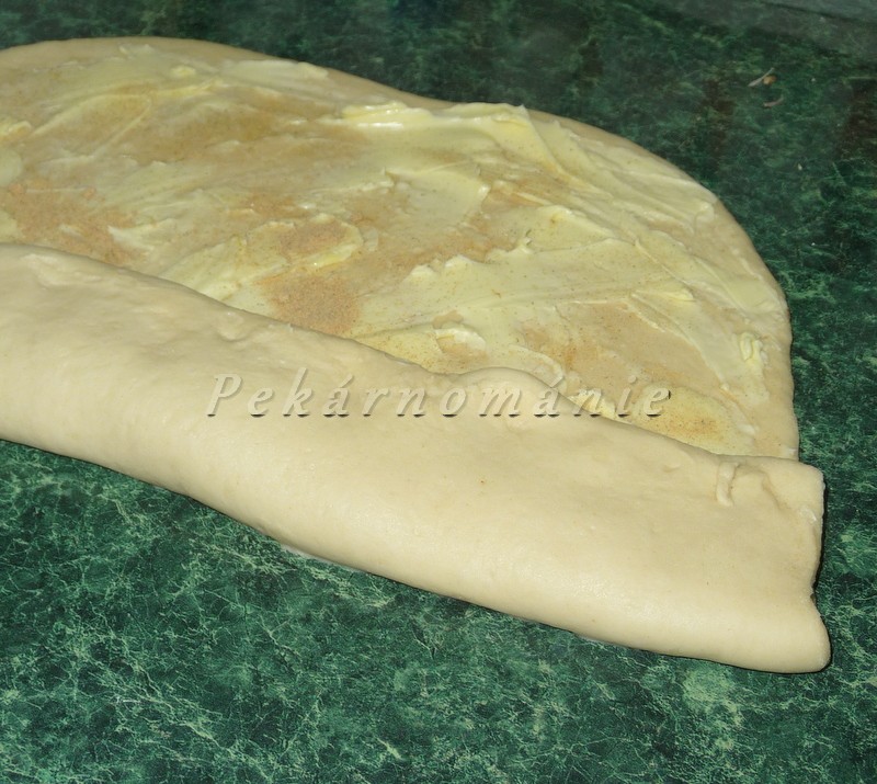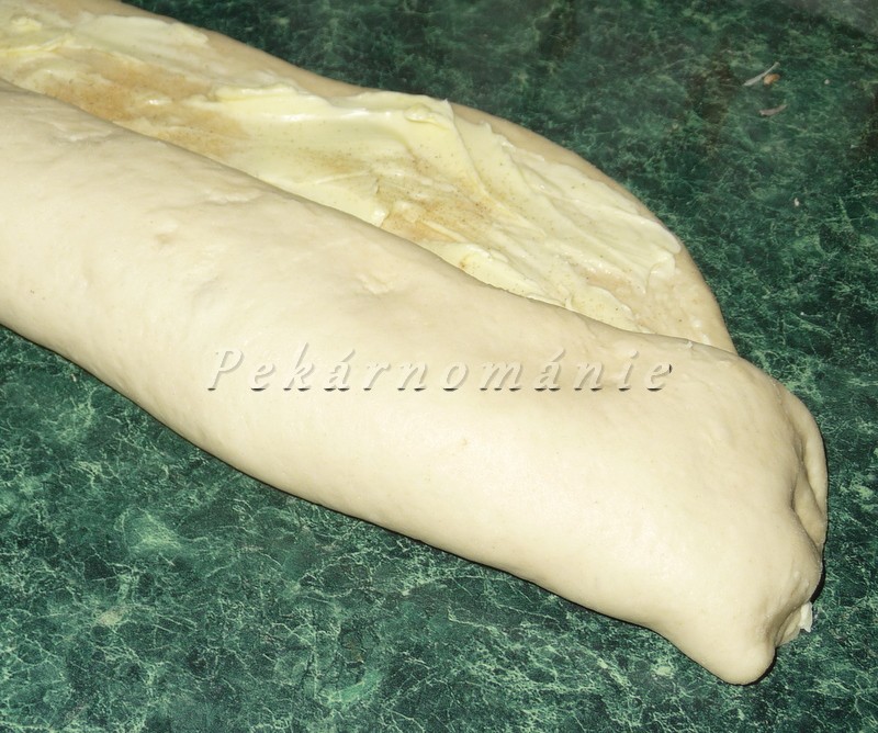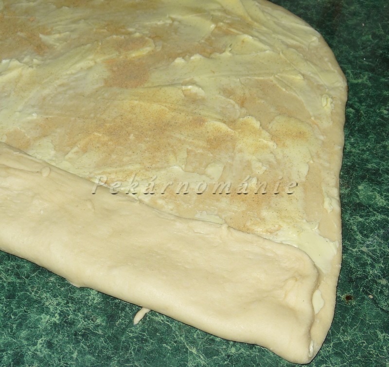 Potřeme změklým máslem, posypeme skořicí a na čtyřikrát složíme. Mírně rozválíme, nakrájíme na 10 dílků, každému nakrájíme „zuby“ jako na hřebenu a všechny dáme vykynout na plech s pečícím papírem nebo fólií.
