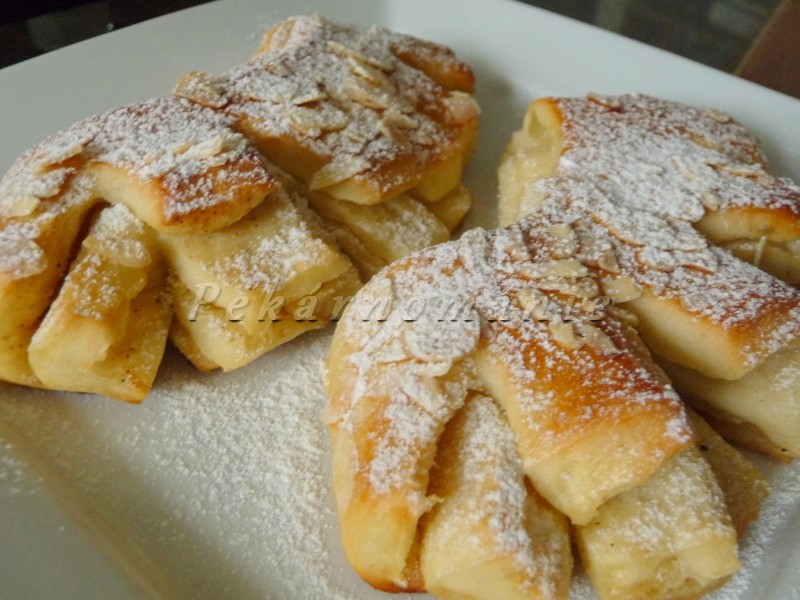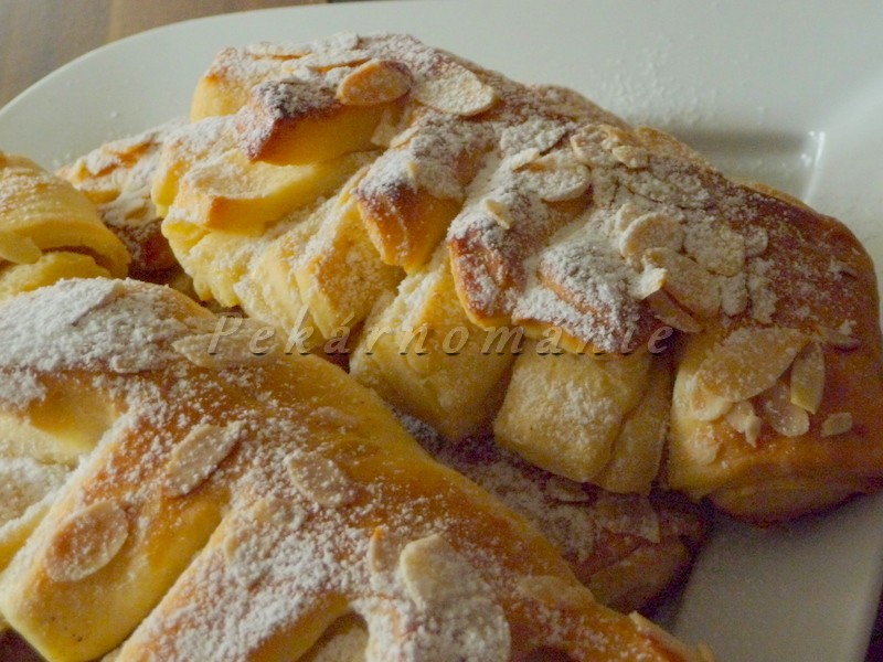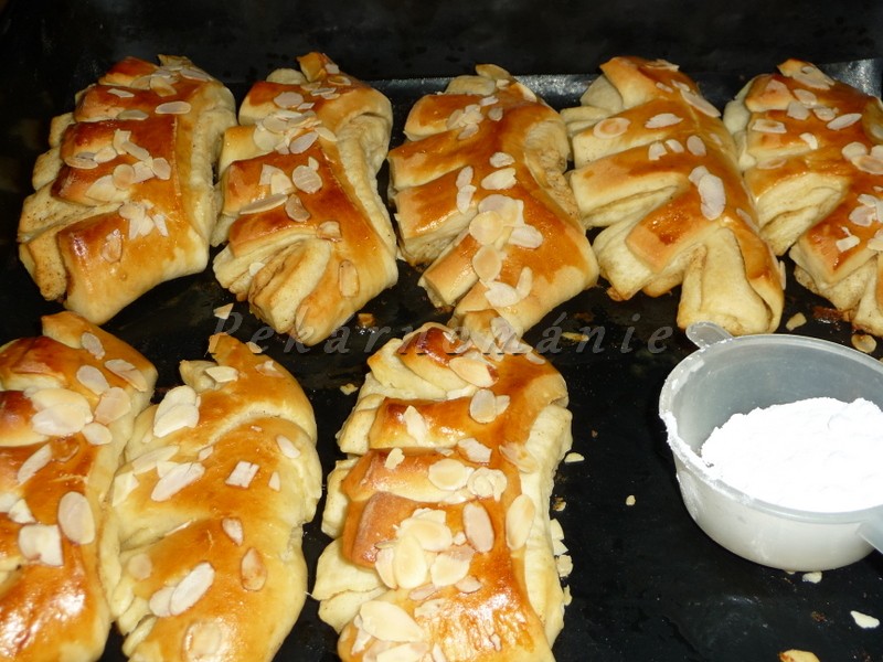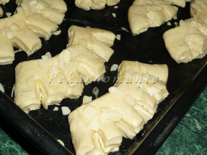 Vykynuté potřeme odloženým vejcem, posypeme lupínky mandlí a upečeme (190°C/17-20min) – při pečení hlídáme, není dobré vypéct dokřupava.