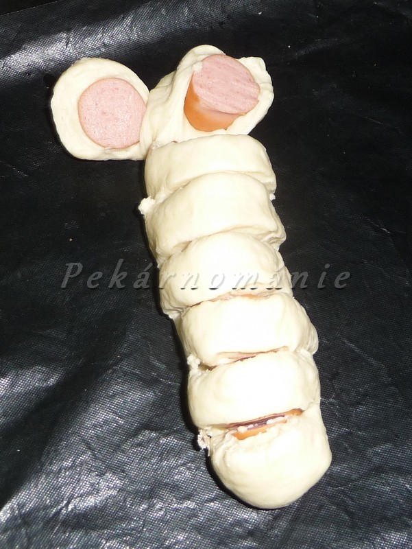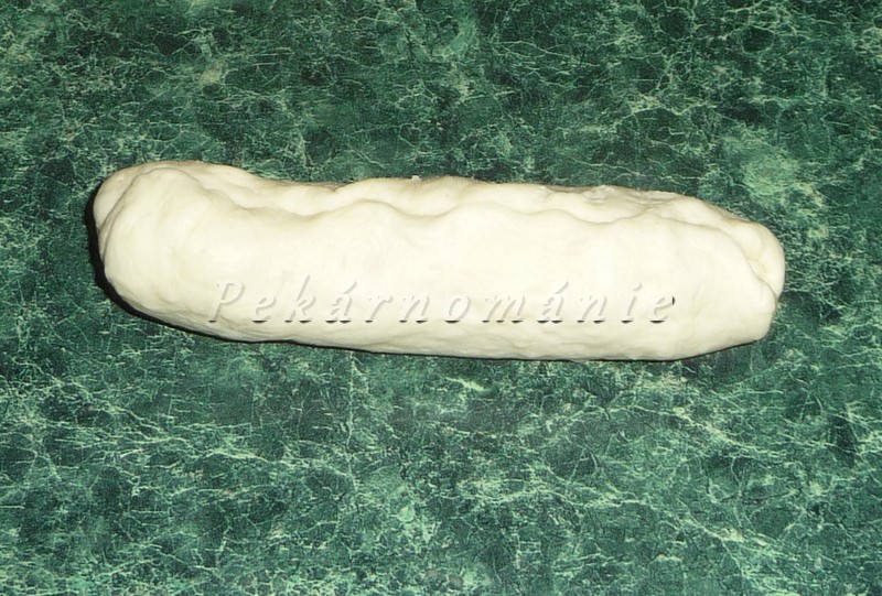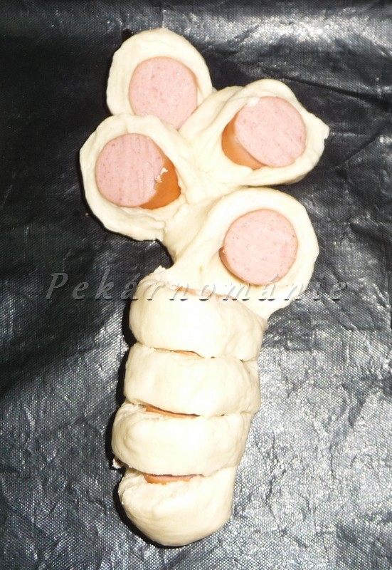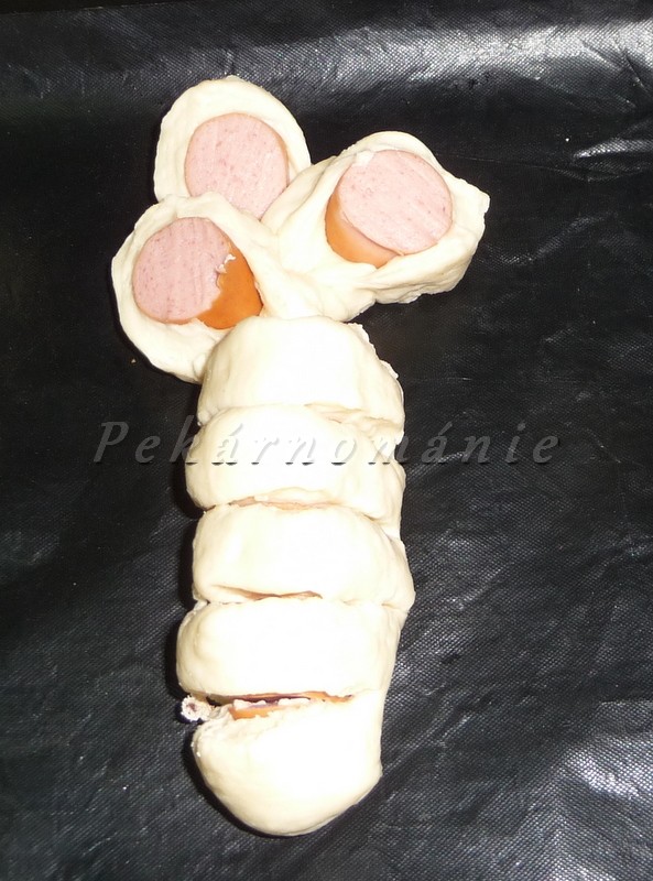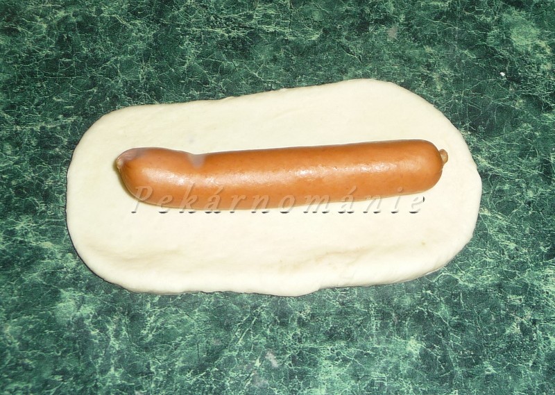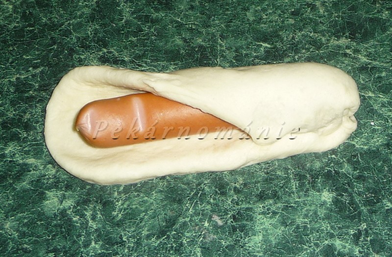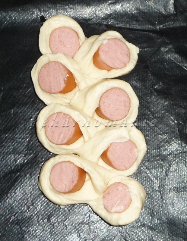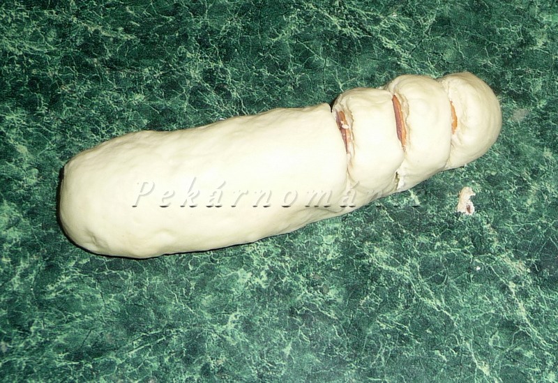 Vykynuté vytáhneme, propracujeme a rozdělíme na 8 dílů. Do každého zabalíme párek a položíme švem dospodu.