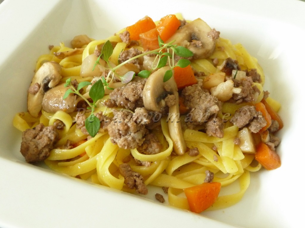 Ragú je voňavé, velice šťavnaté a s plochýma těstovinama a vložkou z hub, česneku a rozmarýnu moc dobře chuťově ladí.