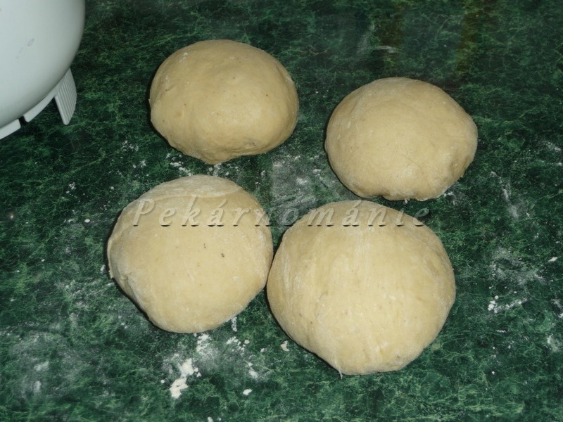 Vykynuté těsto propracujeme, rozdělíme na 4-5 dílů a necháme je 10 minut odpočinout.