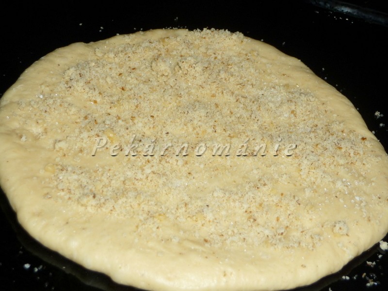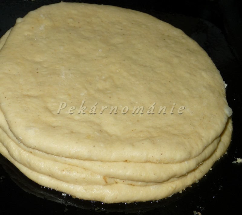 Pak je rozválíme, po jednom položíme na vymaštěný plech, posypeme vanilkovým cukrem a ořechy a přiložíme další plát těsta. Poslední, nejvrchnější plát těsta, zůstane neposypaný.