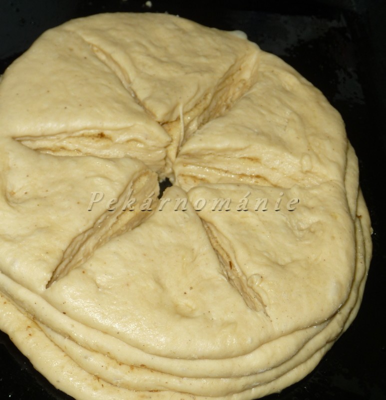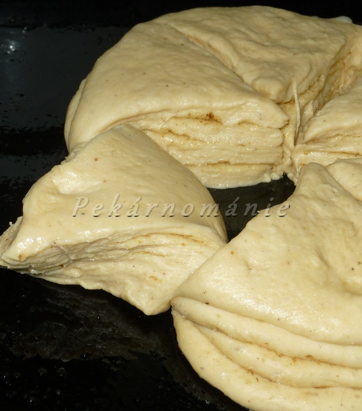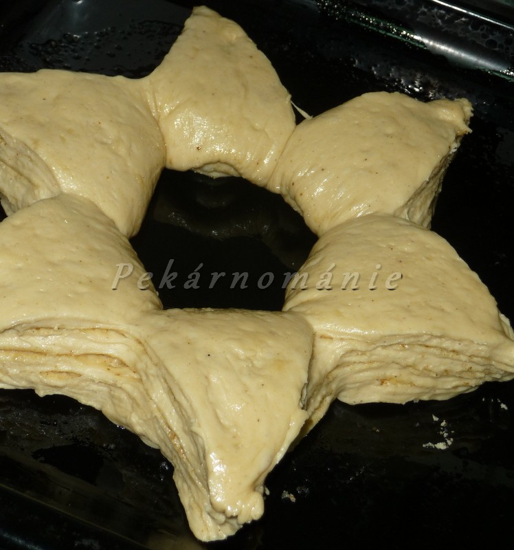 Je-li třeba, navrstvené a prosypané pláty ještě mírně rozválíme a třikrát nakrojíme podle fotopostupu (nedokrajujeme do úplného kraje). Každý cíp zprostřed uchopíme a převrátíme (přetáhneme) ven. Urovnáme do pravidelné hvězdy a necháme vykynout.