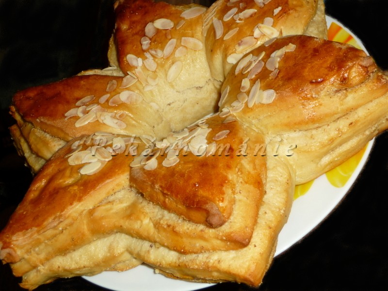 Potřeme vejcem, můžeme sypnout plátky mandlí a upečeme ve vyhřáté troubě (200°C, ihned po vložení zmírnit na 170-180°C a péct asi 30-35 minut).