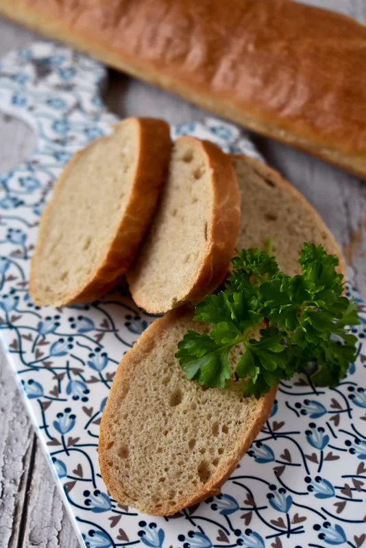 Občas peču místo dvou vek čtyři delší a štíhlé bagety, nakrájím je na rovná kolečka a ta nazdobím jako jednohubky – také jsou moc dobré.